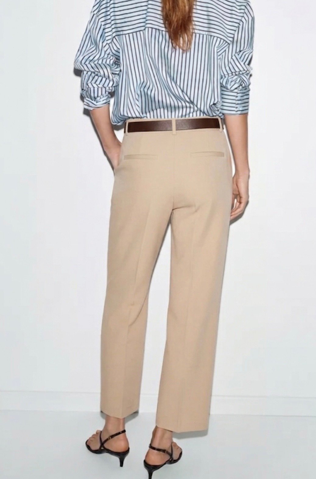 Beige fabric trousers with a brown leather belt; comfortable, practical, and formal; suitable for work and study; Elias fashion.