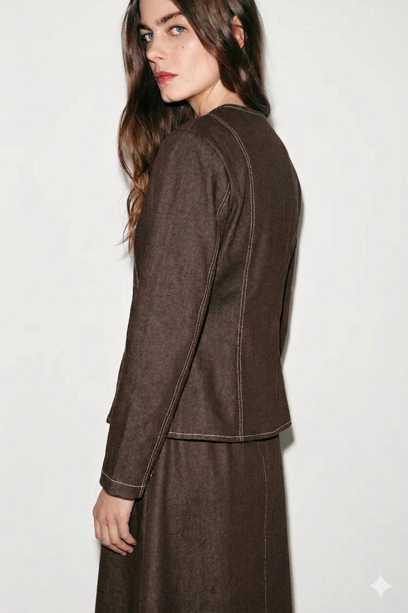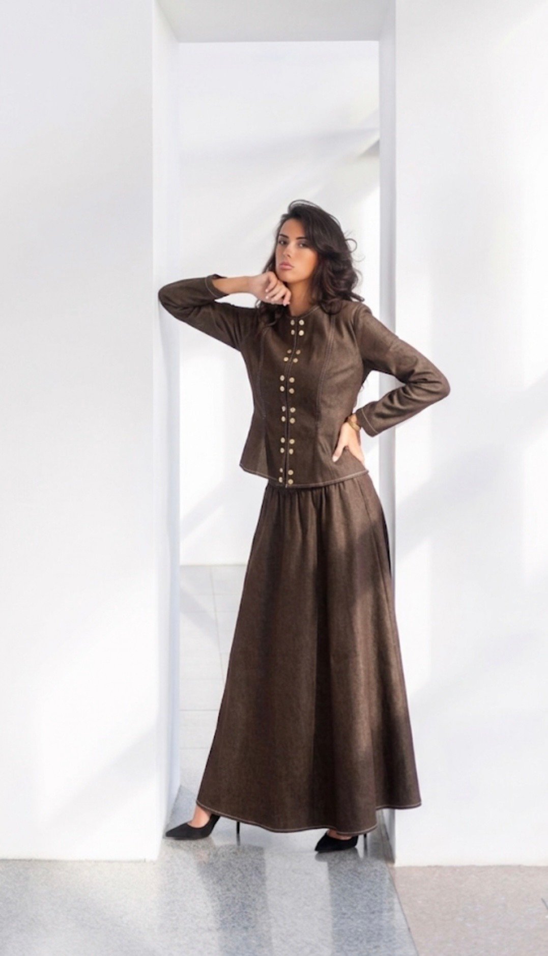 Coffee-colored denim set with white embroidery and gold buttons, skirt and button-down shirt, a modern look by Elias Jordan
