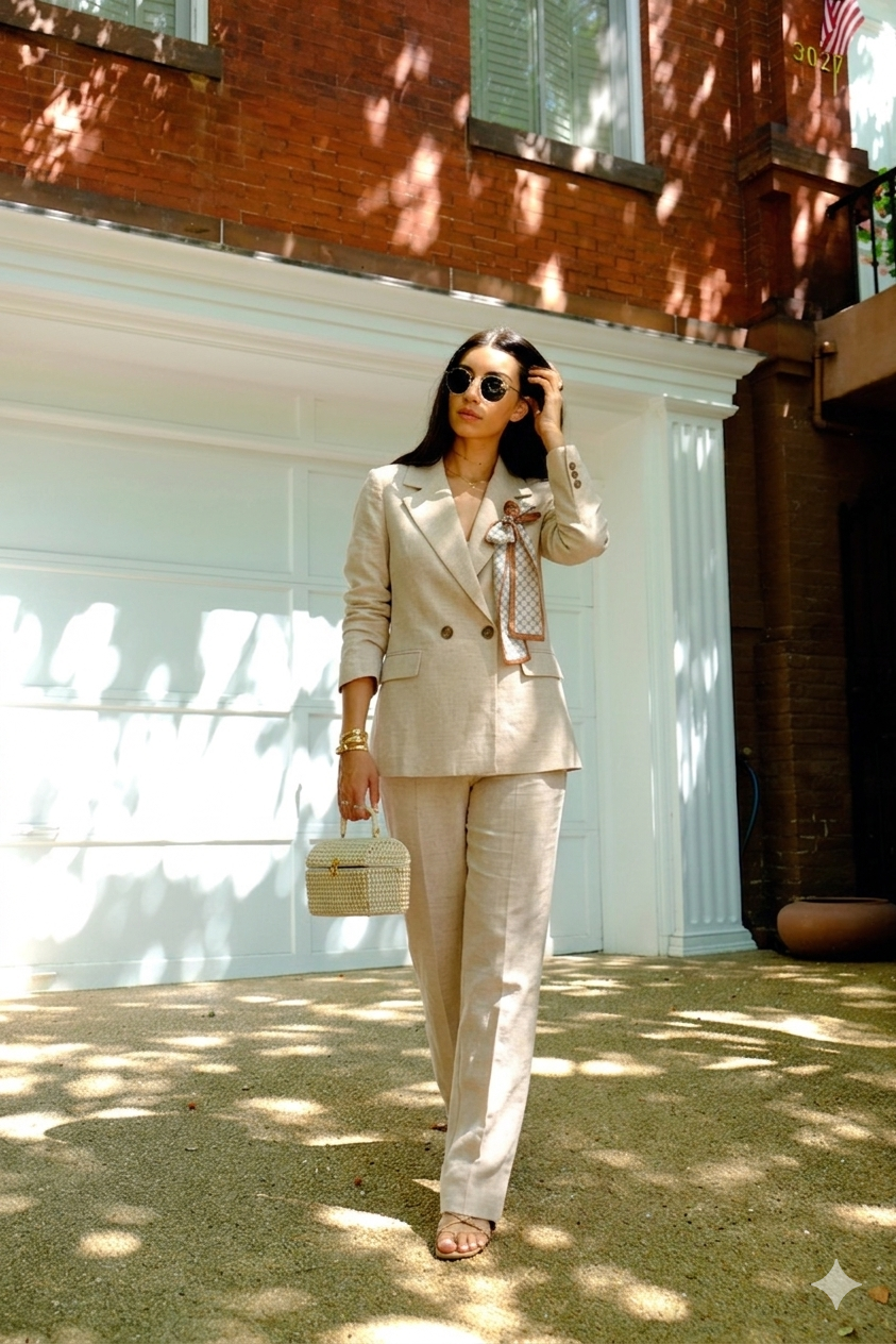 Linen suit with an orange tie, straight-leg trousers with a padded blazer, elegantly casual with a formal touch, Elias Middle East